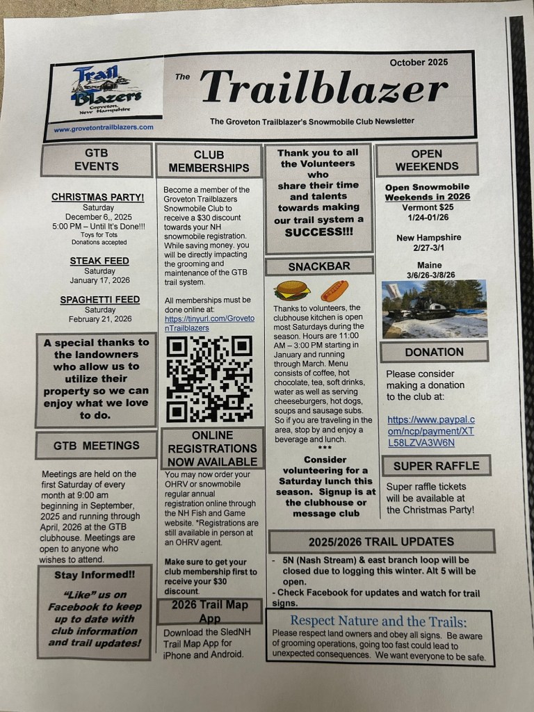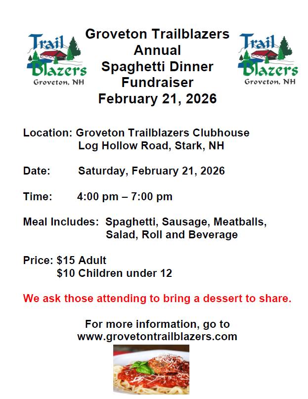 Groveton Trailblazers club meetings are held at 9:00 am at the Groveton Trailblazer clubhouse on the first Saturday of each month between September and April. Upcoming Club meetings will be held on: